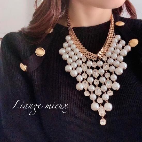スワロフスキービジュー & パールタッセルのトライアングルチェーンネックレス